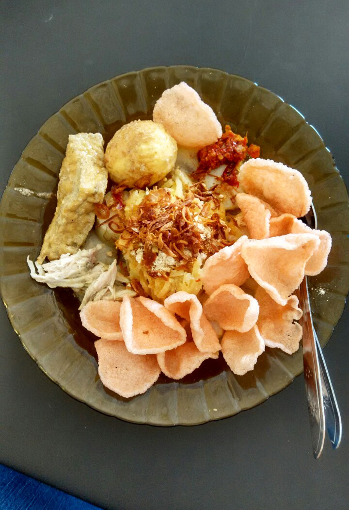 Lontong Capgomeh is one of Peranakans’ Specialties. It comes as a dish-meal (food served in a dish to be eaten at one time). Included in each portion is some pieces of rice cake; thin sliced chayote, a fried boiled egg, a piece of fried tofu, all of these three ingredients are cooked in savory coconut milk gravy; shredded chicken breast which is also cooked in coconut milk gravy (opor ayam suwir); spicy chicken liver fritters (sambal goreng ati ayam); and crackers as a delicacy adder.