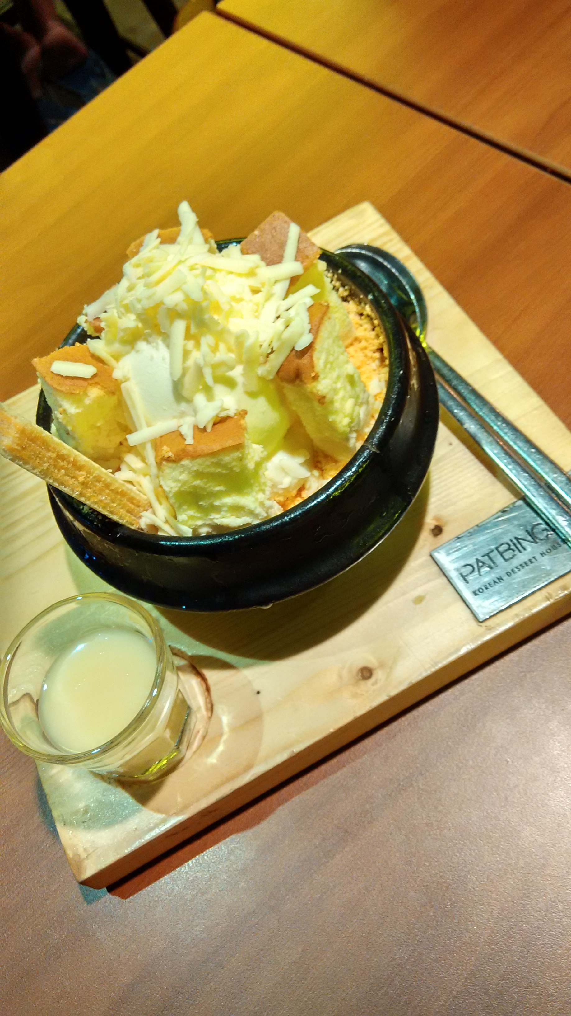 Apgujeong Bingsoo, from Patbingsoo, Flavor Bliss, Alam Sutera, IDR45.000,- It contains Cheese Cake + Cheese Wafer + Grated Cheese + Cheese Powder + Cheese Sauce + Vanilla Ice Cream + Shaved Ice, served with white condensed milk