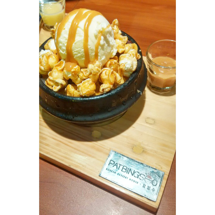 Gangnam Patbingsoo, from Patbingsoo, Flavor Bliss, Alam Sutera, IDR35.000,- It contains Popcorn + Pat (red bean) + Cornflakes + Caramel + Vanilla Ice Cream + Shaved Ice, served with caramel condensed milk